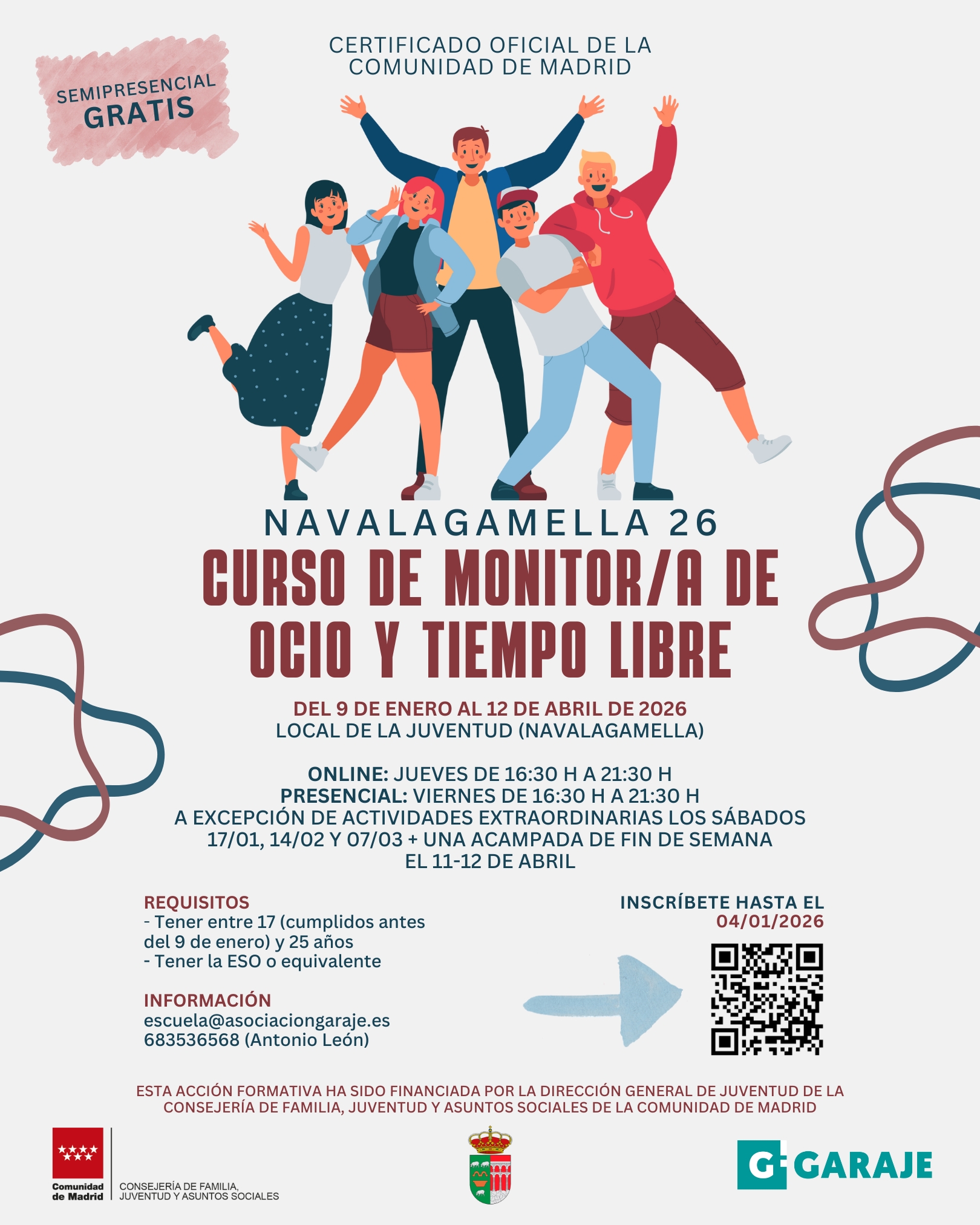 Tras la primera experiencia que vivimos el año pasado, volvemos a Navalagamella para comenzar un nuevo curso de monitor/a de ocio y tiempo libre organizado por el Ayuntamiento de Navalagamella desde el Área de Juventud (Nava Joven) en colaboración con Asociación Garaje y con la financiación de la Consejería de Familia, Juventud y Asuntos Sociales de la Comunidad de Madrid.