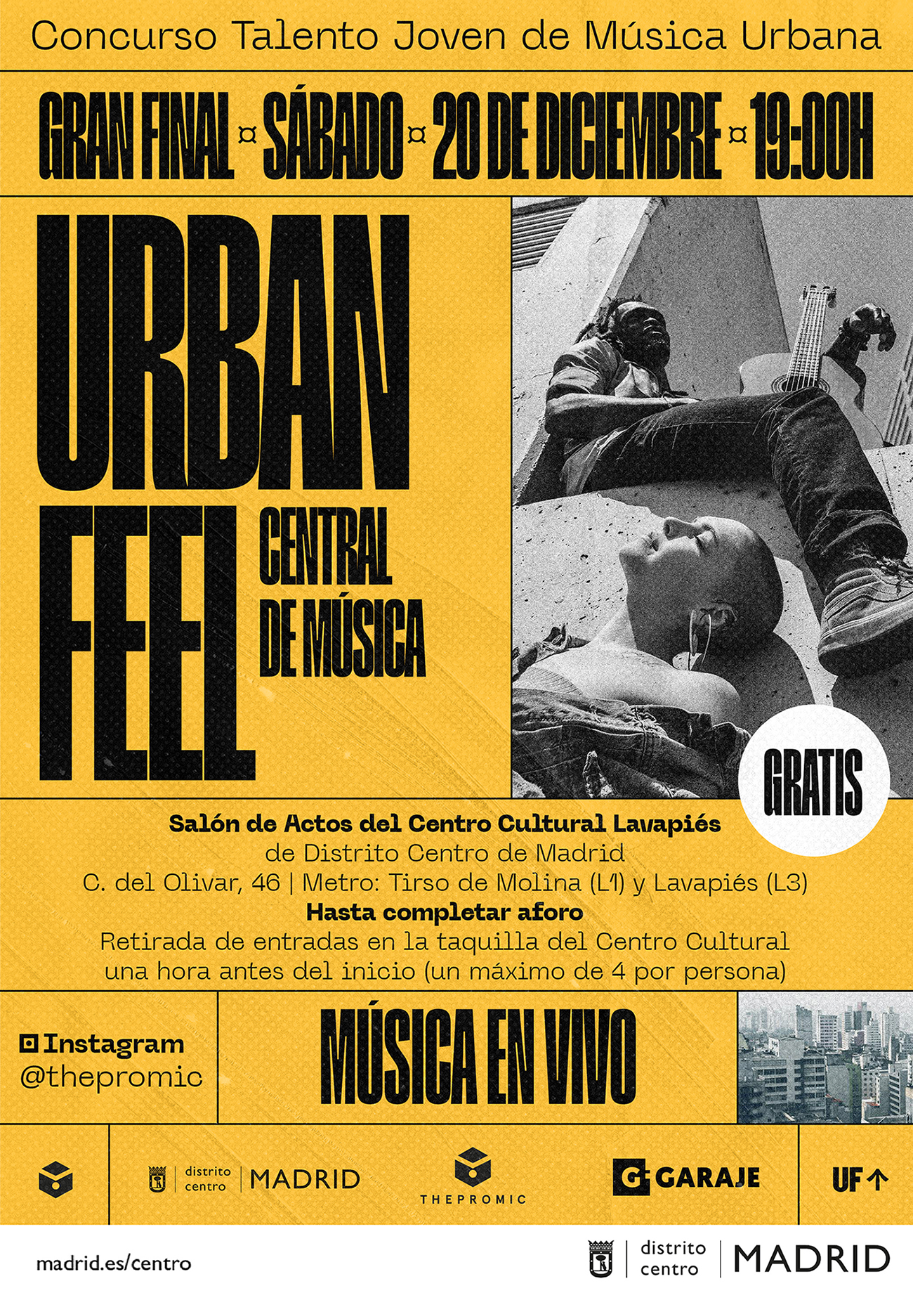 El pasado sábado 20 de diciembre, el Centro Cultural Lavapiés fue el punto de encuentro para la celebración de la Gran Final de la segunda edición del concurso de artistas emergentes Urban Feel Central de Música organizado por THEPROMIC y Asociación Garaje en colaboración con la Junta Municipal del Distrito de Centro, una iniciativa centrada en visibilizar y proyectar nuevas voces de la música urbana, consolidando espacios reales de exhibición y crecimiento para la juventud creadora.