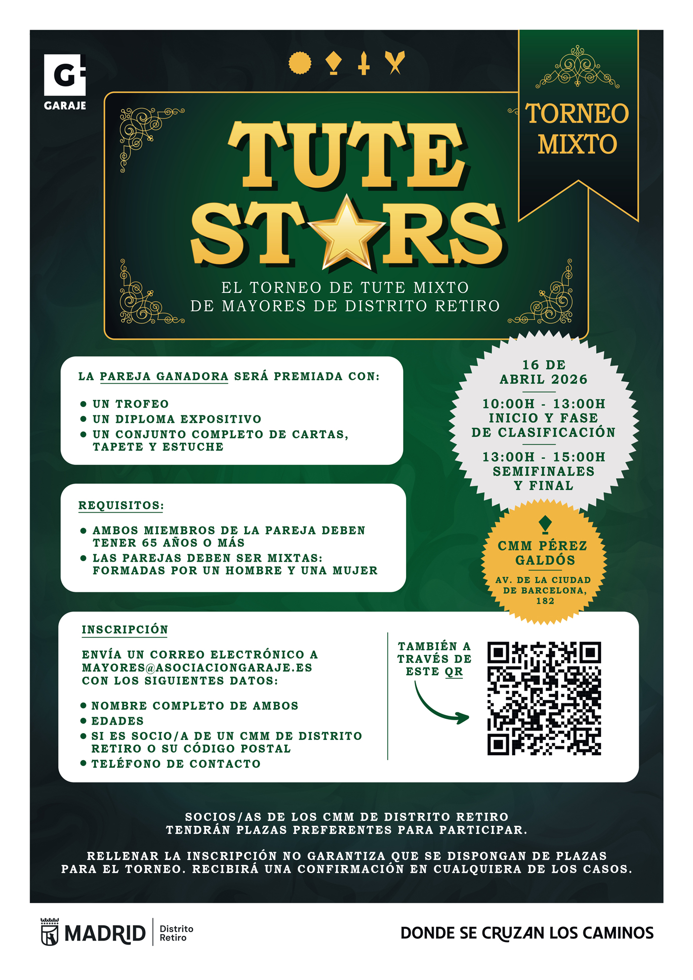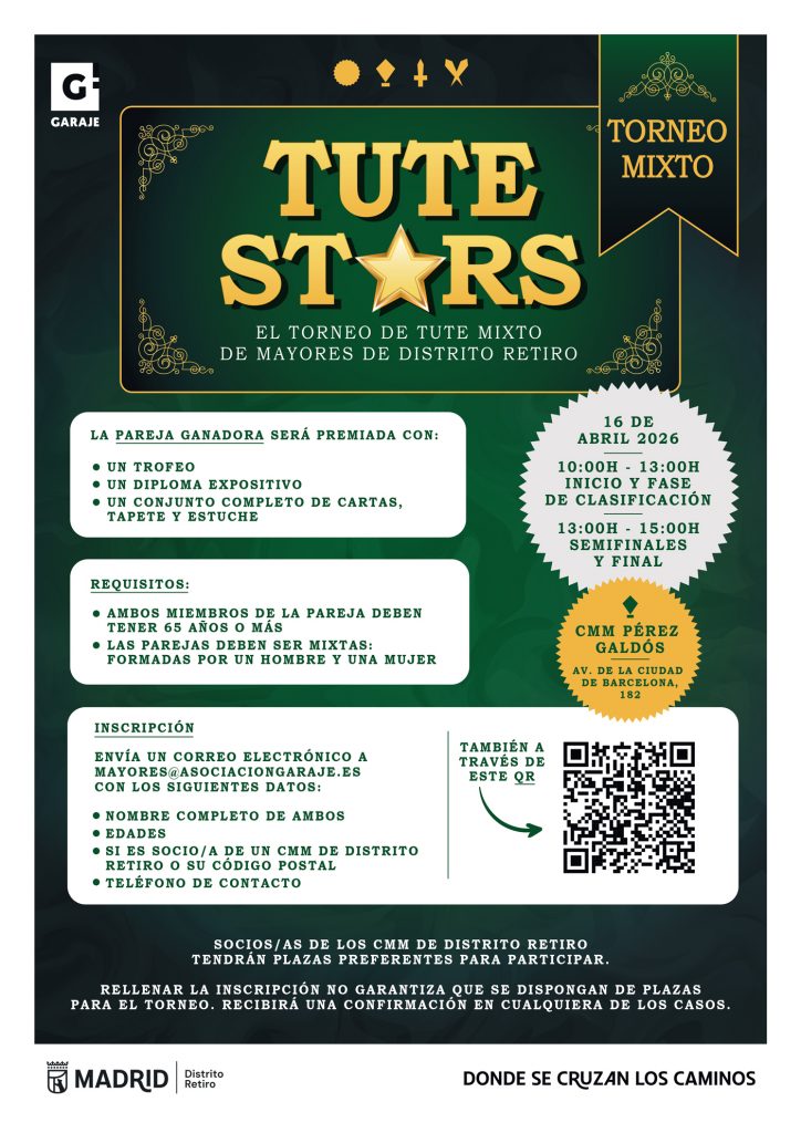 Si quieres formar parte de esta jornada de ocio y convivencia en un ambiente de alfombra roja, el próximo 16 de abril de 2026 tienes una cita ineludible en el CMM Pérez Galdós (Av. de la Ciudad de Barcelona, 182). El torneo dará comienzo a las 10:00h, pero recuerda que las plazas son limitadas y se asignan por orden de inscripción, con preferencia para socios y socias de los centros de mayores del Distrito Retiro. Sólo tienes que elegir a tu pareja mixta y completar el formulario de inscripción que encontrarás en nuestra web oficial:
