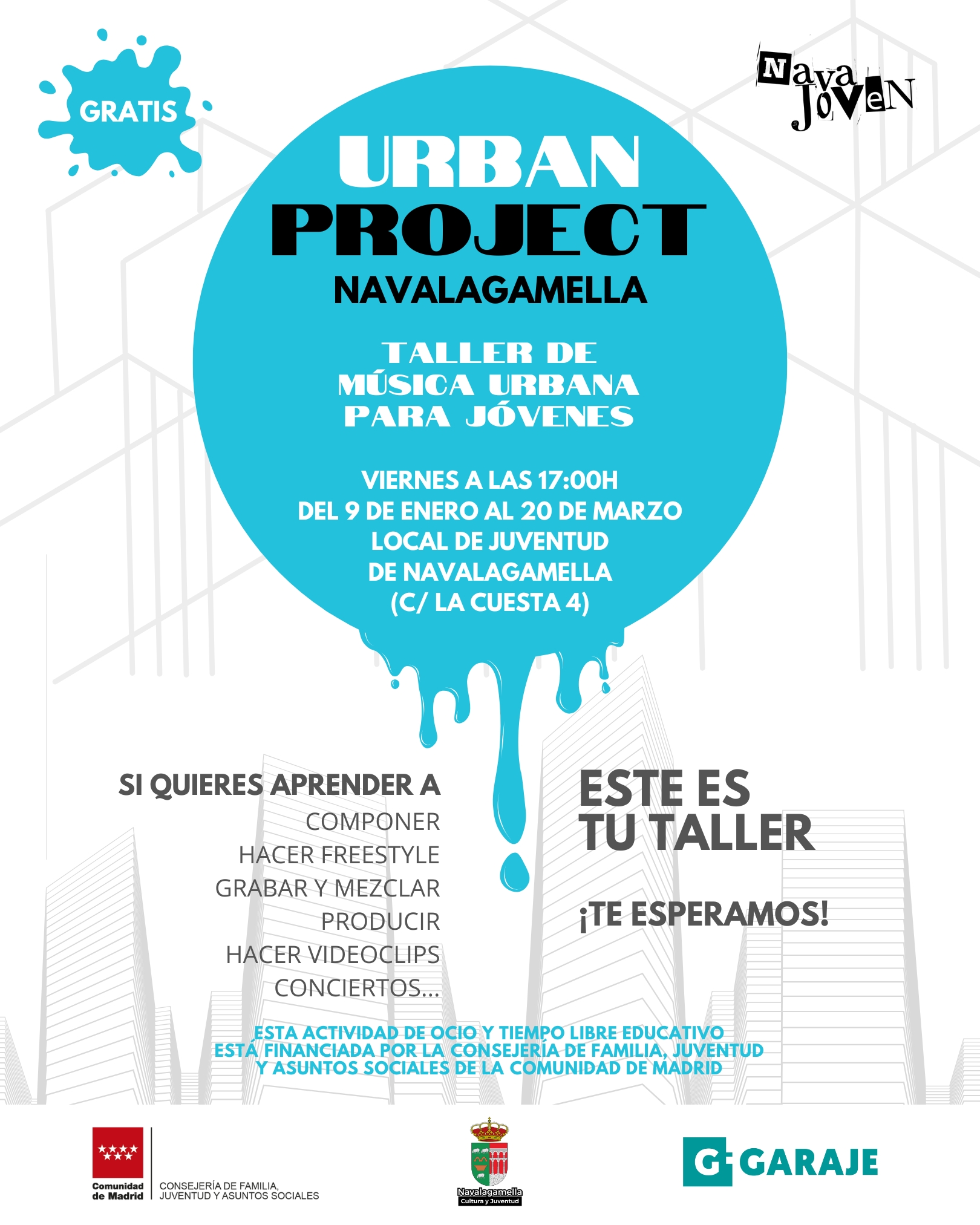 Este 2026 comienza con energía y creatividad en Navalagamella gracias a la nueva edición de Urban Project (UP), el taller de música urbana para jóvenes organizado por el Ayuntamiento de Navalagamella desde el Área de Juventud (Nava Joven) en colaboración con Asociación Garaje y la Consejería de Familia, Juventud y Asuntos Sociales de la Comunidad de Madrid. El proyecto se desarrollará desde el 9 de enero hasta el 20 de marzo en horario de tarde en el Local de la Juventud, y reúne a un nuevo grupo de chicos y chicas, junto con participantes que repiten tras la experiencia del año pasado.